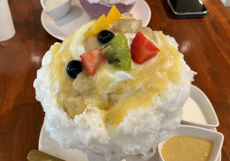 Fluffy natural ice shaved ice is topped with milk and banana juice. On top of it are strawberries, kiwi and bananas. Eat the first bite as soon as it is offered. The fluffy texture changes over time. It is sweet and cooool, and it cooools your body when you walk around the city.